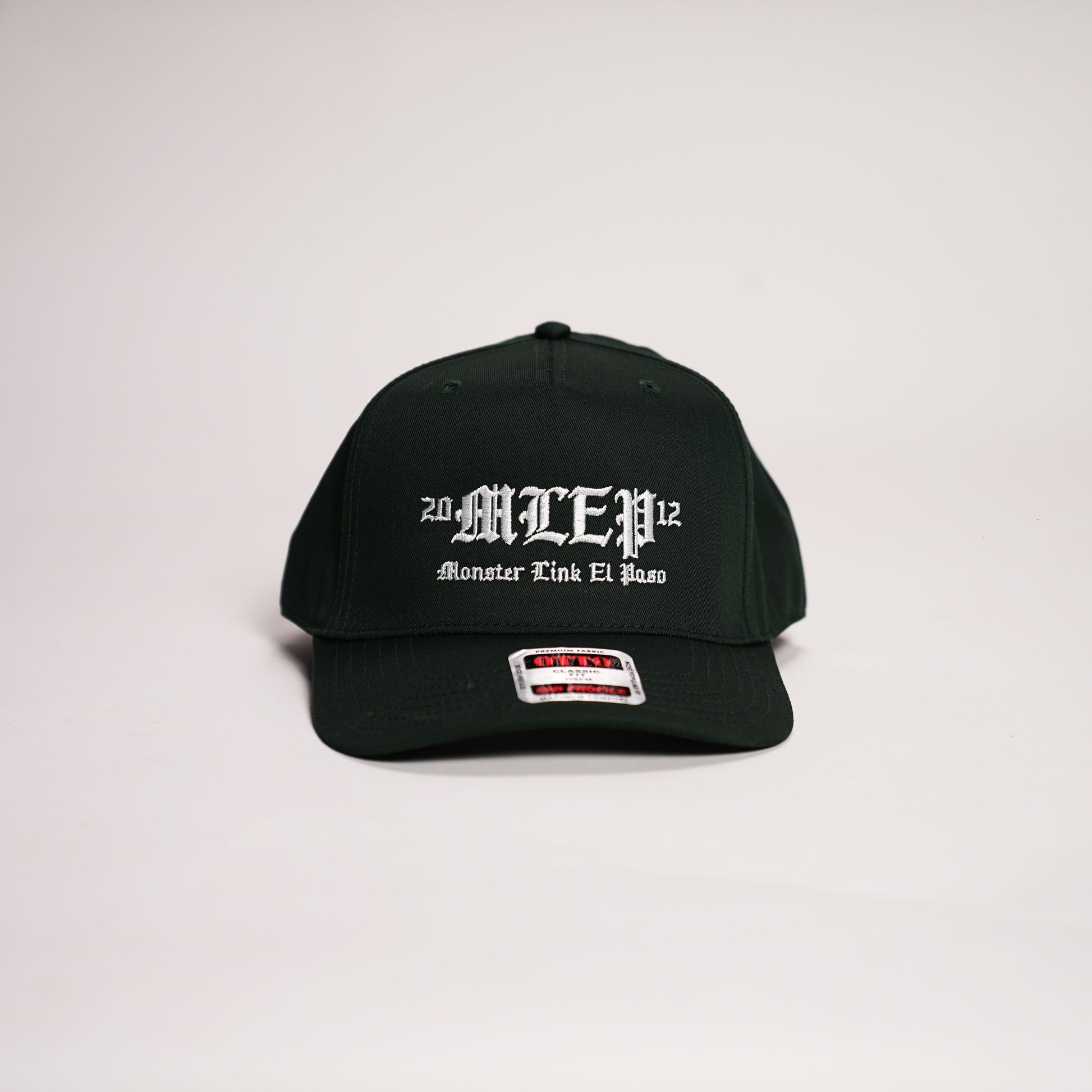 Bold “MLEP 2012” white embroidery on a deep hunter green crown